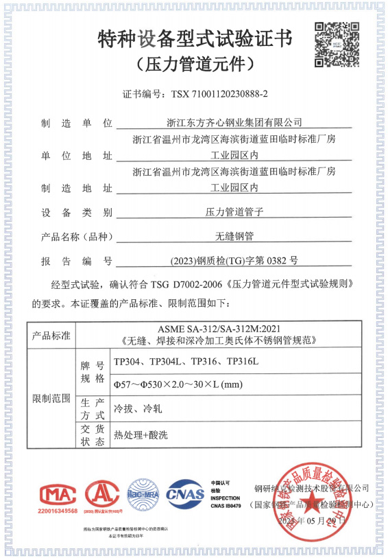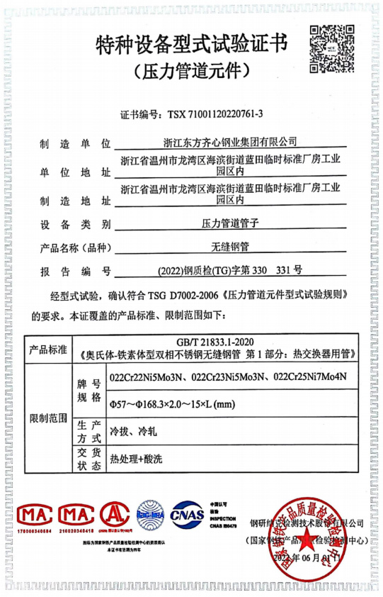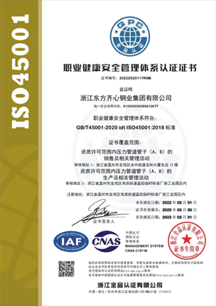 公司始終堅持生產高性能不銹鋼管的產品定位,持續改進品質。先后取得了不銹鋼管特種設備(壓力管道元件)認證等多張生產許可證,并通過ISO9001:2015質量管理體系、ISO14000:2004環境管理體系認證、GB/T28001-2011職業健康安全管理體系認證。